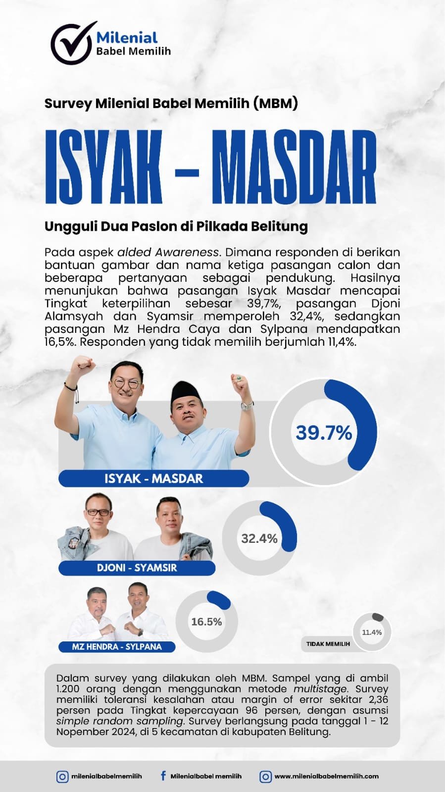 Berita | Politik | • 14 November 2024 • Dukungan Semangkin Menyala, Isyak-Masdar Unggul Dalam Survei MBM Pemilihan Kepala Daerah Kabupaten Belitung 2024 Head-linenews.com, Belitung – Lembaga Milenial Babel Memilih (MBM) merilis hasil survei terkait pemilihan kepala Daerah...